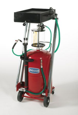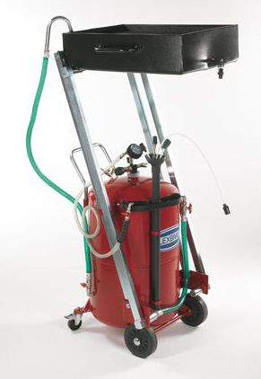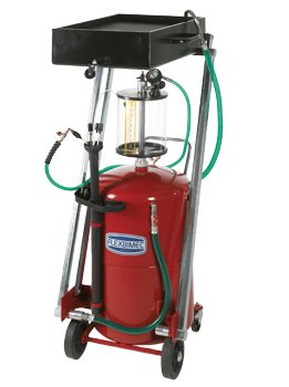 Артикул 3192. Передвижной резервуар для отсоса и слива отработанного масла, объемом 115 л, с прозрачной 10-ти литровой колбой, 50-ти литровой чашей с пантографом из окрашенной стали. Оснащен индикатором уровня, с комплектом зондов разных диаметров и инструментальным лотком. Имеет пневматическое опорожнение резервуара.