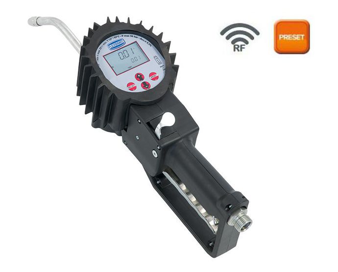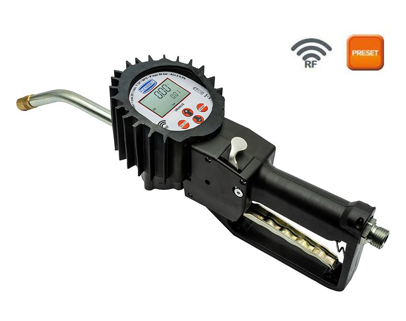 Электронный расходомер с функцией предустановки, для раздачи масла, с овальными шестернями, серия URANUS, с раздаточным пистолетом, резиновым защитным кожухом, спусковой скобой, жесткой трубкой Ø 16 мм, автоматическим каплеотсекателем и поворотным соединением M 1/2” BSP.