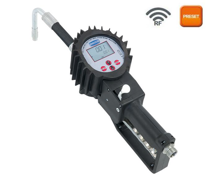Электронный расходомер с функцией предустановки, для раздачи масла, с овальными шестернями, серия URANUS, с раздаточным пистолетом, резиновым защитным кожухом, спусковой скобой, гибкий резиновый шланг, жесткий наконечник 90°, поворотное соединение с резьбой M 1/2” BSP.