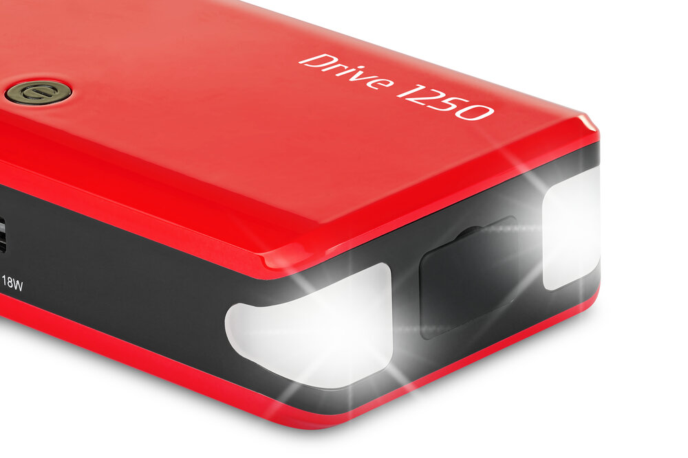 DRIVE 1250 12V - сверхкомпактное многофункциональное литиевое, аварийное пусковое устройство 12 В для мотоциклов, автомобилей, кемперов, морских двигателей, фургонов. Переносное устройство для аварийного запуска с литиевым аккумулятором на 12 В. Максимальный пусковой ток 1500 A. Powerbank для интеллектуальной и быстрой зарядки электронных устройств через USB (Quick Charge) и для питания 12 В устройств. В устройстве используются высокоэффективные литиевые батареи LiPo, которые обеспечивают полную и быструю зарядку, а также компактность и малый вес. Оснащенный 2 высокоинтенсивными светодиодными лампами, прибор становится источником освещения, когда это необходимо.