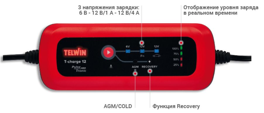 T-CHARGE 12 - зарядное устройство нового поколения!Многофункциональное электронное зарядное устройство с функцией поддержания заряда для аккумуляторов типа WET, GEL, AGM, MF, Pb-Ca, EFB напряжением 6/12В. В режиме Pulse Tronic есть возможность выбрать зарядное напряжение: 6 В, 12 В /1A (мотоцикл) и 12 В /4A (авто). Устройство укомплектовано кабелем с зажимами и кабелем с петельками.